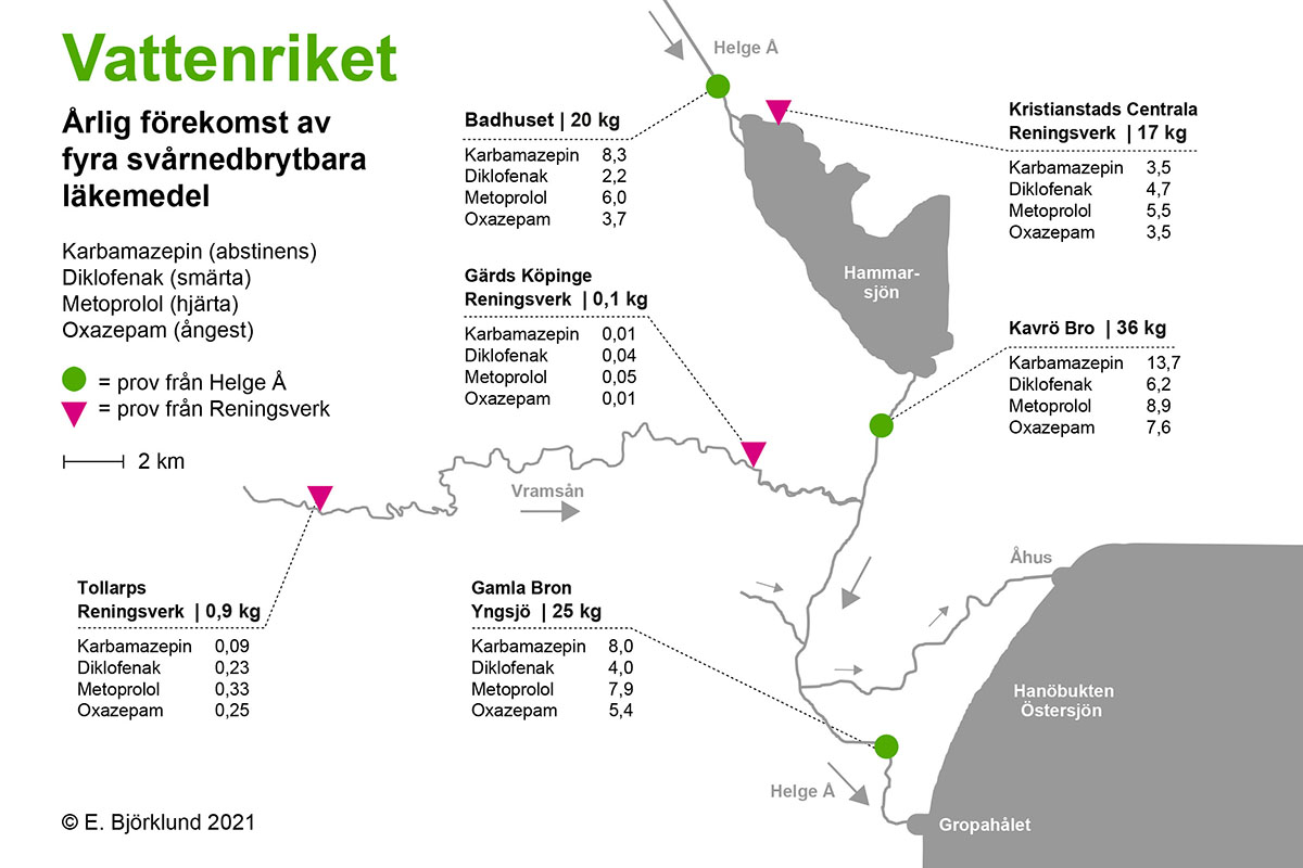 Mätningar i Helge ås vatten, bredvid gamla badhuset vid Tivoliparken, visar att sammanlagt 20 kg av dessa fyra läkemedel flödar in i Vattenriket varje år, troligen från reningsverk i kommuner norr om Kristianstad. Samtidigt släpper Kristianstads centrala reningsverk ut nästan lika mycket läkemedel till reningsverkskanalen, vars vatten därefter pumpas ut i Hammarsjön vid Pynten. Från reningsverket uppmättes totalt 17 kg av dessa fyra läkemedel.